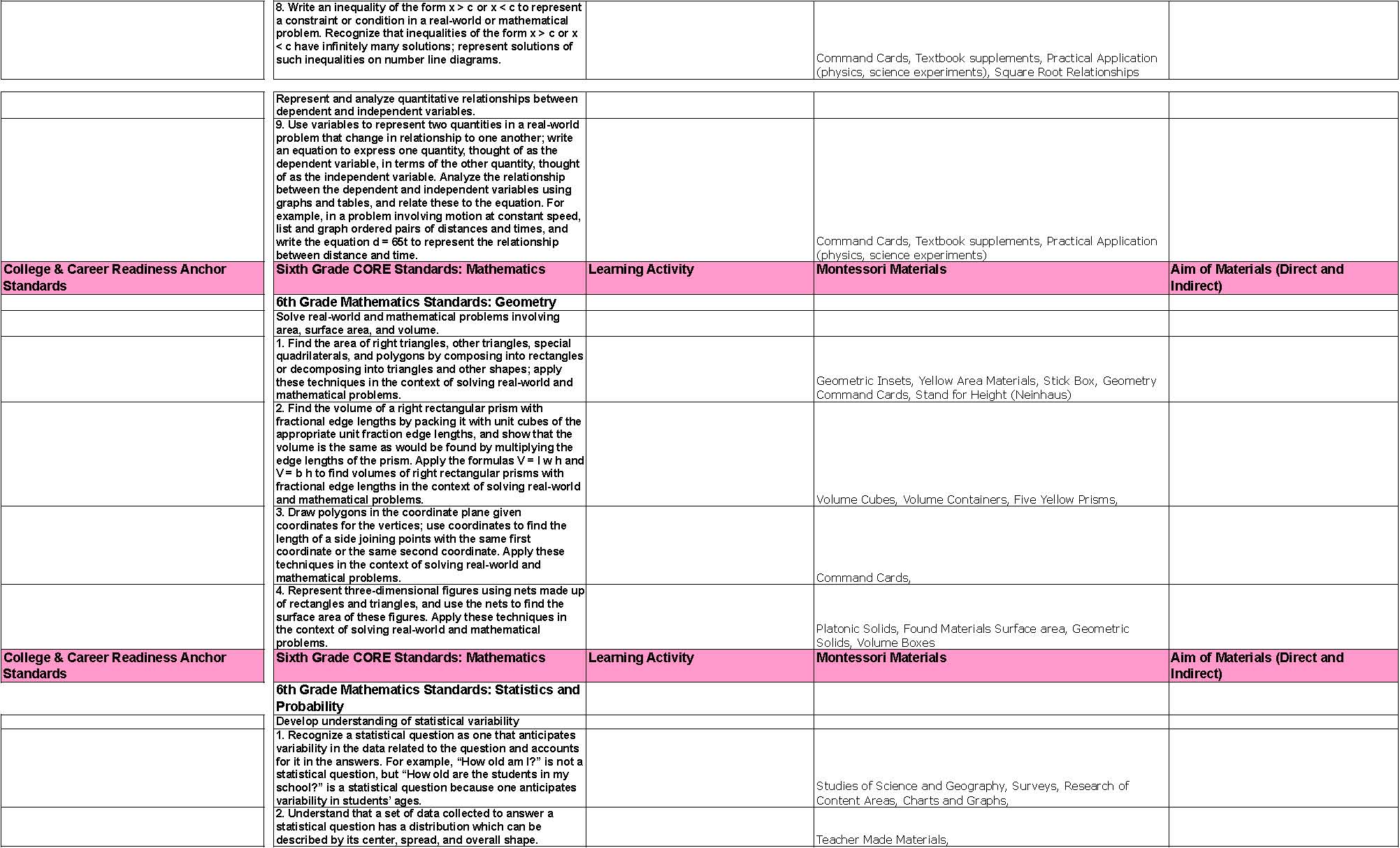 | College & Career Readiness Anchor Standards | 2. Write, read, and evaluate expressions in which letters stand for numbers. Write expressions that record operations with numbers and with letters standing for numbers. For example, express the calculation “Subtract y from 5” as 5 – y. Identify parts of an expression using mathematical terms (sum, term, product, factor, quotient, coefficient); view one or more parts of an expression as a single entity. For example, describe the expression 2 (8 + 7) as a product of two factors; view (8 + 7) as both a single entity and a sum of two terms. Evaluate expressions at specific values of their variables. Include expressions that arise from formulas used in real-world problems. Perform arithmetic operations, including those involving whole-number exponents, in the conventional order when there are no parentheses to specify a particular order (Order of Operations). For example, use the formulas V = s3 and A = 6 s2 to find the volume and surface area of a cube with sides of length s = 1/2. 8. Solve real-world and mathematical problems by graphing points in all four quadrants of the coordinate plane. Include use of coordinates and absolute value to find distances between points with the same first coordinate or the same second coordinate. Sixth Grade CORE Standards: Mathematics 6th Grade Mathematics Standards: Expressions and Equations Apply and extend previous understandings of arithmetic to algebraic expressions. 1. Write and evaluate numerical expressions involving whole-number exponents | Learning Activity | Fact Families, Algebraic Decanomial, Story of the Kings, Cubing Materials, Colored Counting Bars, Binomial Squares and Trinomial Squares, Bead Cabinet, Albanesi Math Command Cards, Bead Bars Longitude and Latitude activities, Montessori Materials Bead Chains, Base work (eg Base 2, Base 9), Binomial/Trinomial Cubes, Command Cards | Aim of Materials (Direct and Indirect) |
